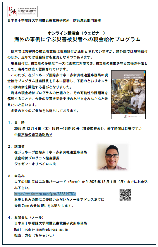 救護活動等で得た知見を広く社会に発信・還元をし、研究・教育活動を通じて、救護の向上と活動領域の拡大に寄与することで被災者の苦痛の予防・軽減に資することを目的とした研究所です